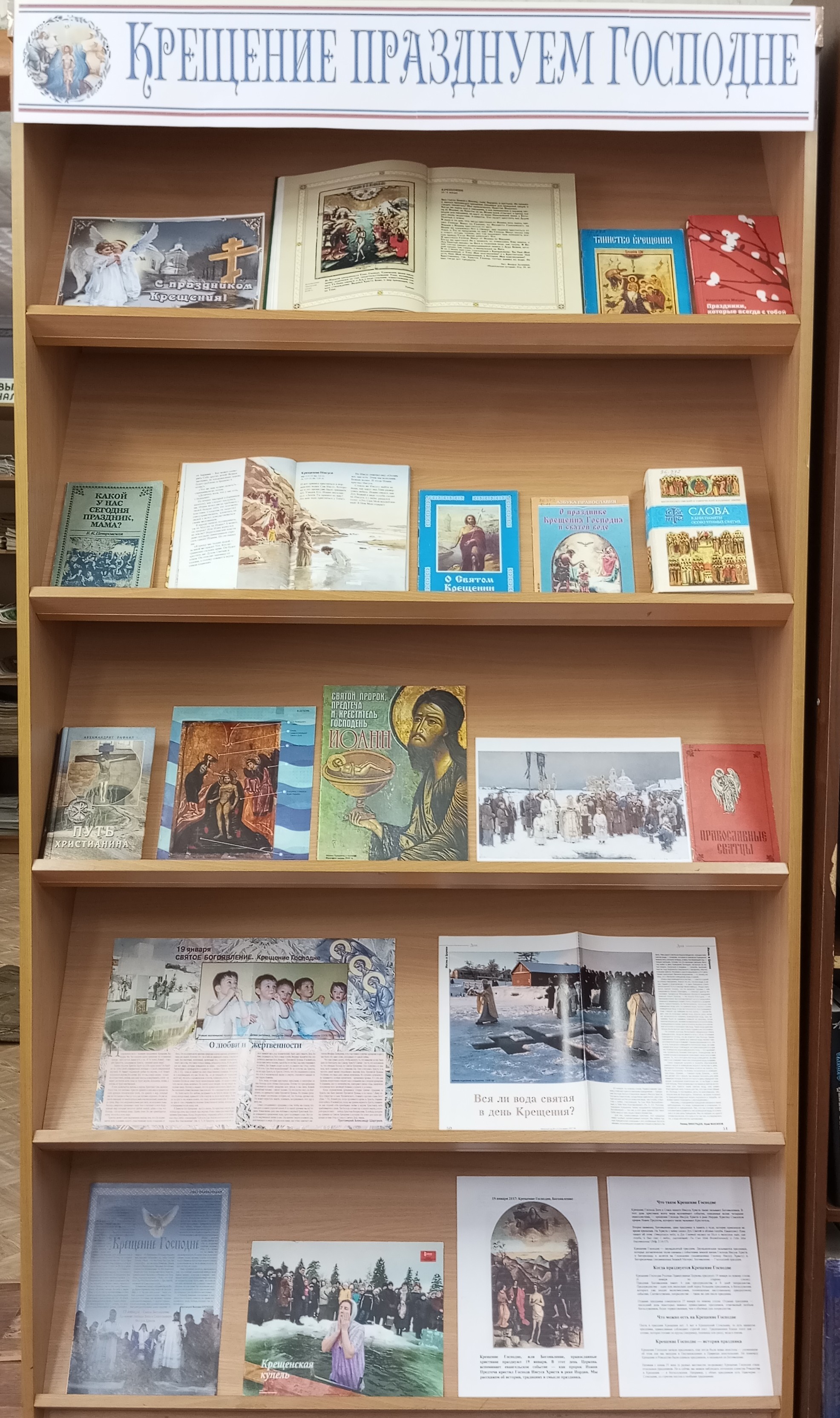В библиотеке организована книжная выставка к празднику Богоявления, которая содержит книги о празднике, его обычаях и традициях. Здесь можно будет увидеть и прочесть научно-популярные издания о русской культуре и быте, а также материалы из периодики.