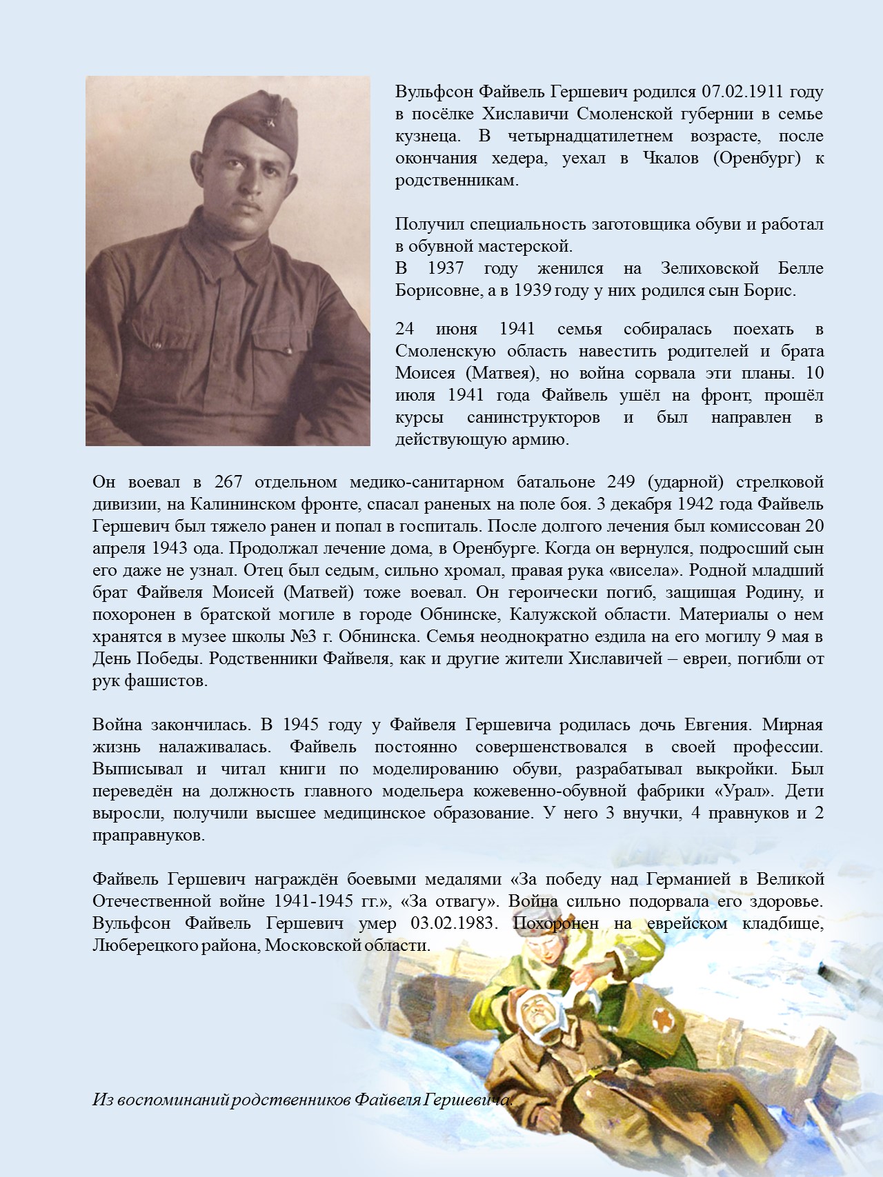 В выпуске рассказывается о нашем земляке, уроженце местечка Хиславичи Вульвсон Файвель Гершевиче санинструкторе 267 отдельного медико-санитарного батальона 249 (ударной) стрелковой дивизии, спасавшем раненых на поле боя.