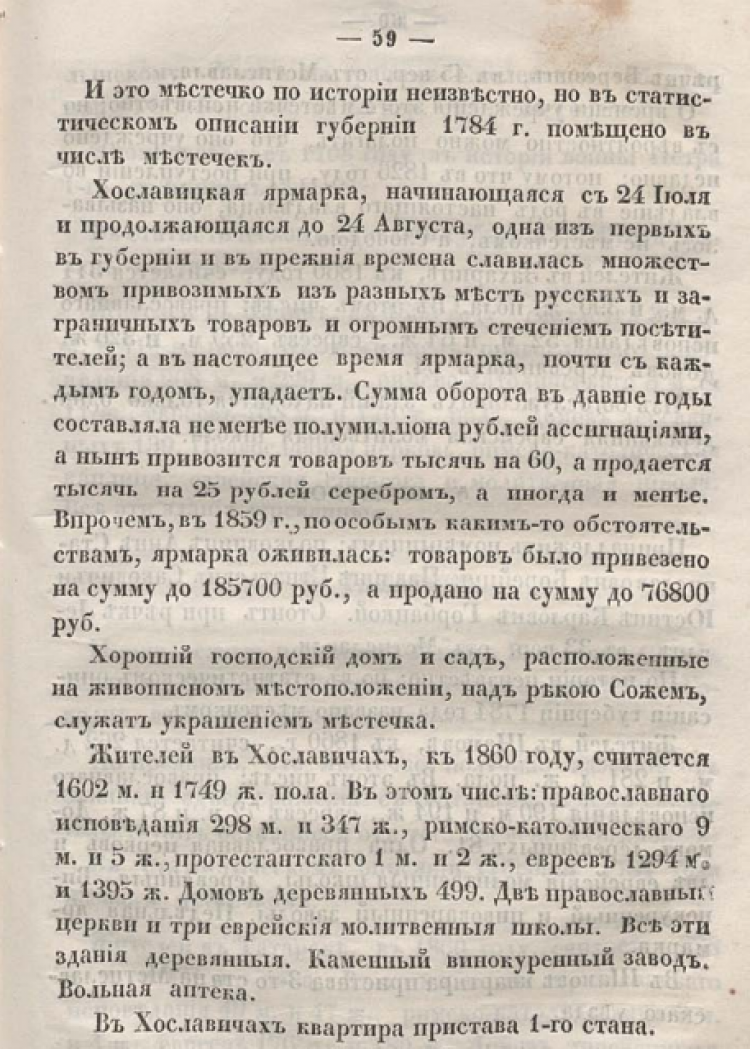 Жителей в Хославичах, к 1860 году, считается 1602 мужского и 1749 женского пола. В этом числе: православного вероисповедания 298 мужчин и 347 женщин, римско-католического 9 мужчин и 5 женщин, протестантского 1 мужчина и 2 женщины. Евреев 1294 мужчины и 1395 женщин. Домов деревянных 499. Две православных церкви и три еврейские молитвенные школы. Все эти здания деревянные. Каменный винокуренный завод. Вольная аптека.