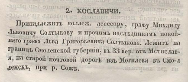 Принадлежит коллежскому асессору, графу Михаилу Львовичу Салтыкову и прочим наследникам покойного графа Льва Григорьевича Салтыкова. Лежит на границе Смоленской губернии, в 33 верстах от Мстиславля, на старой почтовой дороге из Могилева в Смоленск, при реке Сож.