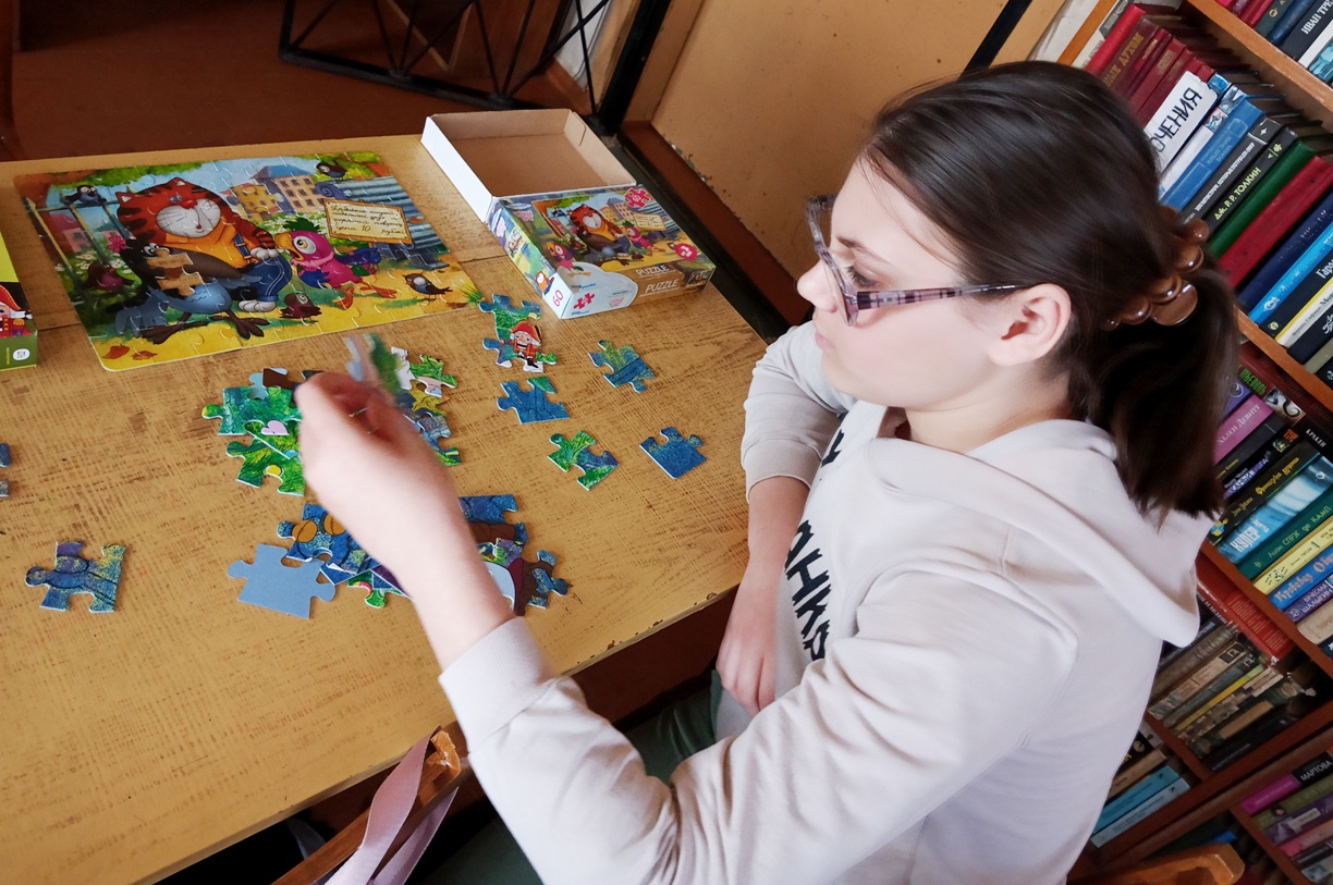 Библиотекарь, желая подарить детям альтернативу телефонам и компьютерам, заменив их живым общением, пригласила ребят к совместному собиранию пазлов. Дети с огромным удовольствием погрузились в процесс: подбирали детали, обсуждали стратегии, помогали друг другу. Каждый собранный пазл становился маленькой победой, а общая атмосфера была невероятно теплой и дружелюбной.